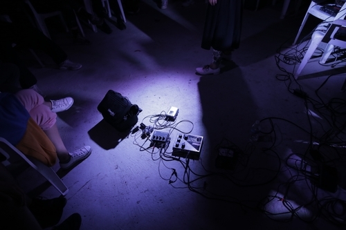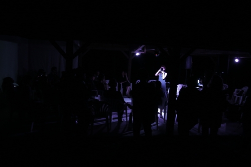 Helga Fassonaki’s solo performance as "yek koo" at Catskill Zendo's Enjoy The Silenz retreat merges the visual, poetic, and physical through an exploration of amplified voice, breath, horn, and rhythm. The performance reveals the interplay between sound and physical space, amplified by Fassonaki’s use of the environment to create a dynamic auditory and spatial experience. The dimly lit setting, as captured in the photograph, adds an intimate atmosphere that enhances the tension and harmony between her movements, the sounds emitted, and the gathered audience.